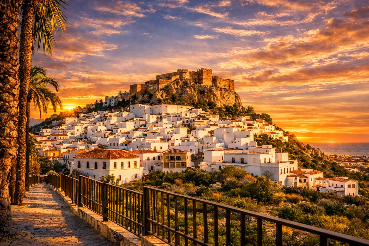Casas blancas, castillo árabe y vistas increíbles al Mediterráneo.